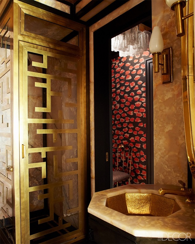 In the guest bath, the walls and vanity top are pink onyx, the sink, by Bates and Bates, and fittings, by Waterworks, are brass, the vintage sconces are French, and the shower stall is custom made.